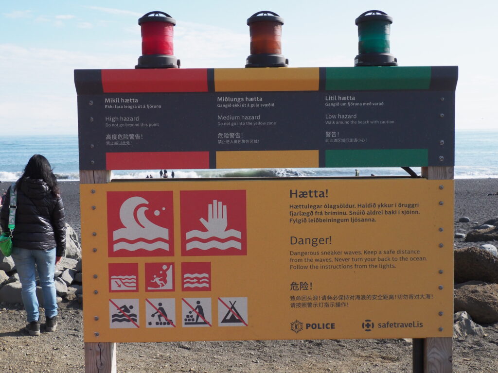 Am Strand steht eine große Warntafel mit einer Ampel, die vor den gigantische Wellen, die sehr gefährlich sind, weil sie Menschen ins Meer reißen können, warnt. Wir hatten Alarmstufe Orange.